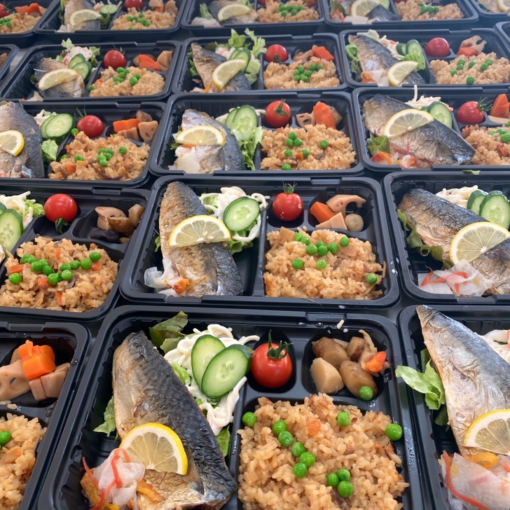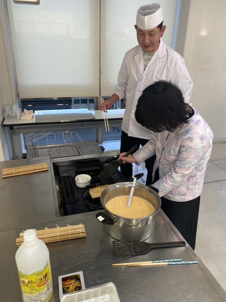 鯖の塩焼き、なます、サラダ、スパゲッティサラダ、五目煮、炊き込みご飯、だし巻き卵体験でした。