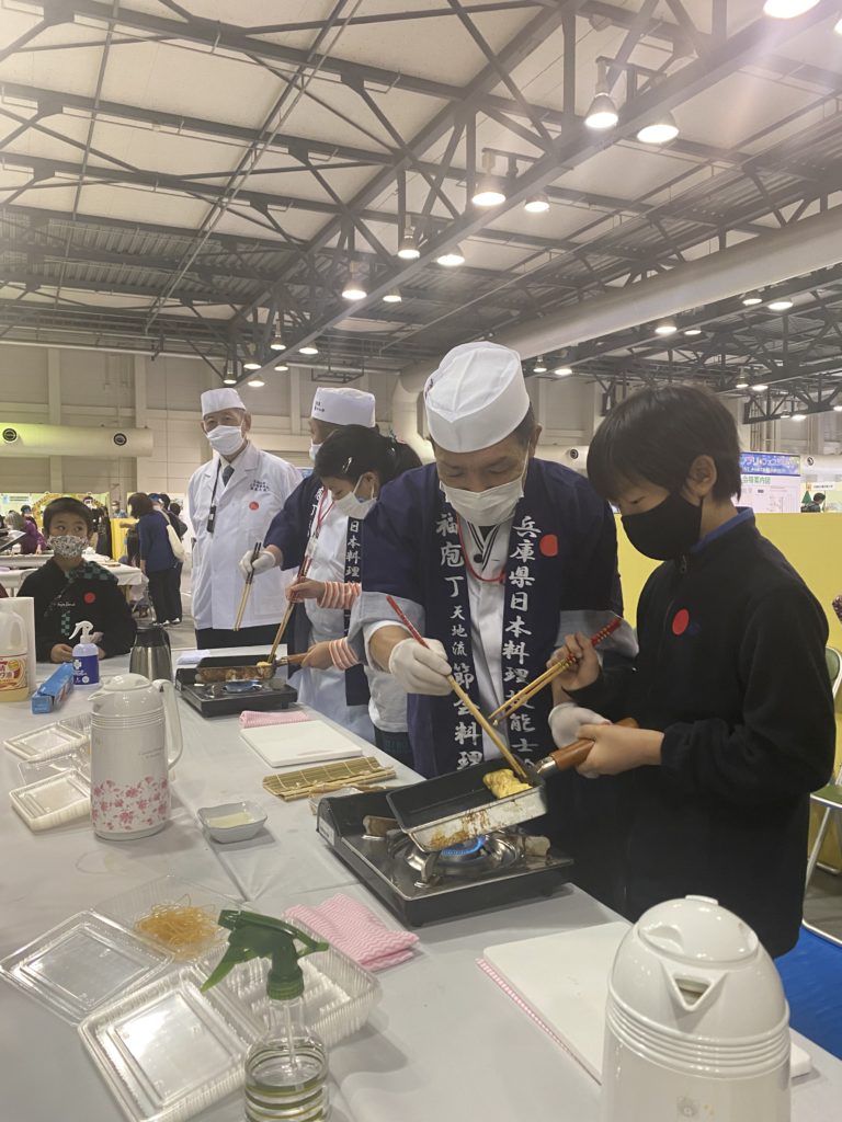 11月30.31日神戸国際展示場にて兵庫県技能グランプリフェスタ2021開催されました、日本調理技能士会は、だし巻き体験、ブースでは食彩細工の展示、りんご食彩細工のこども体験で大変賑やかなイベントとなりました。