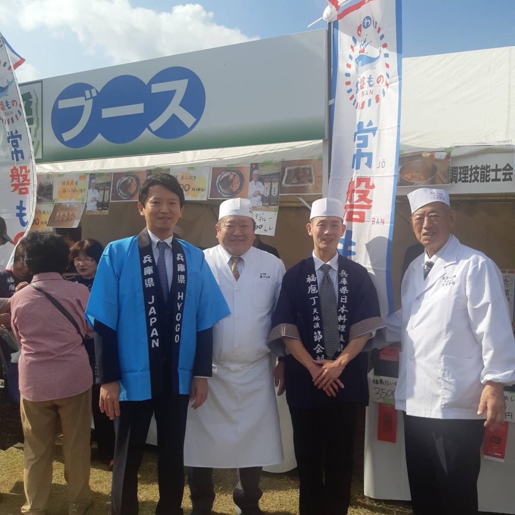 一社)兵庫県日本調理技能士会では、福島県の水産物のPR、秋鮭入り稲荷寿司の販売、福島県の鯛飯、兵庫県の鯛の荒焚きの販売。