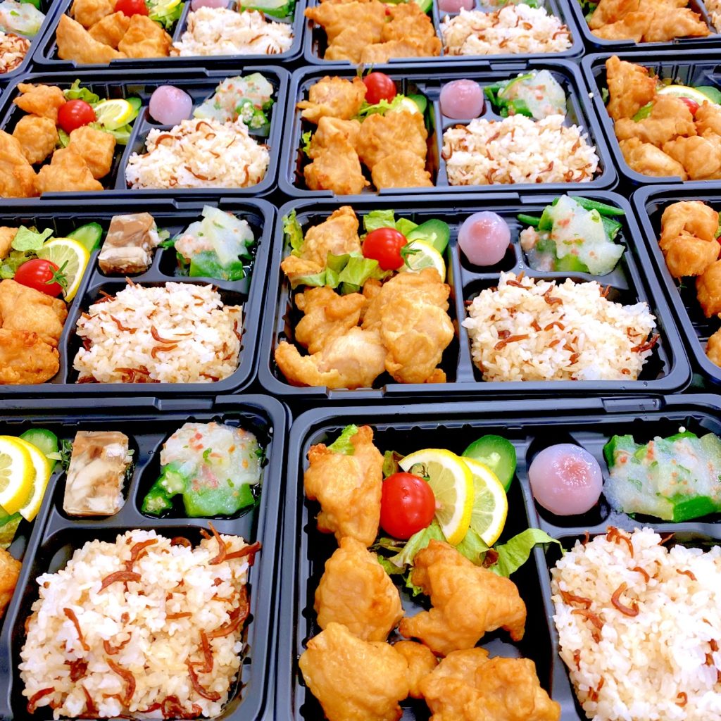 唐揚げ、サラダ、野菜の湯葉和え、いかなごご飯、イチゴ餅、だし巻き卵です。今日はみかんの飾り切りも。