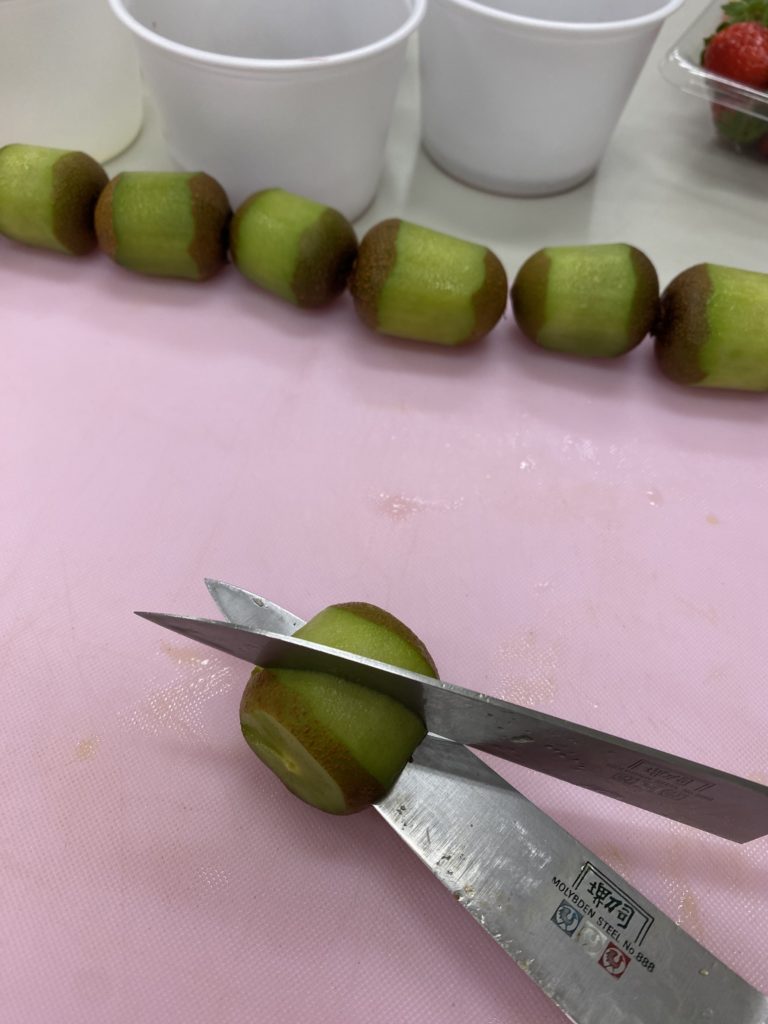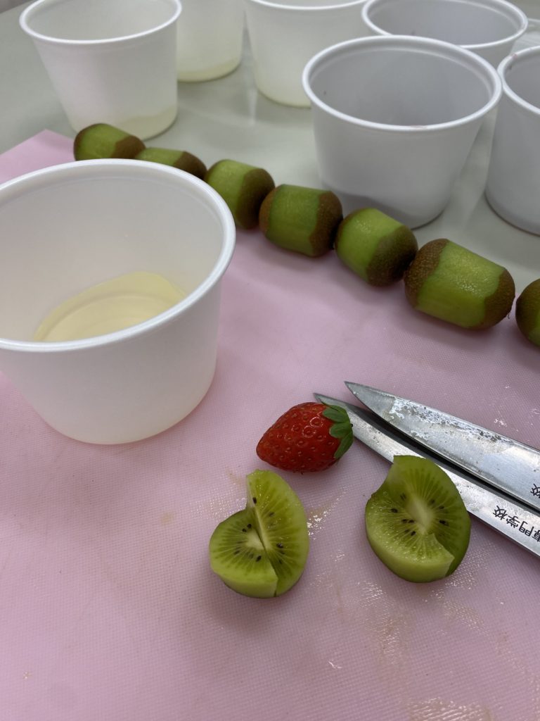今日は、ミニキユウイの飾り切り、いちごをゼリーに乗せて。