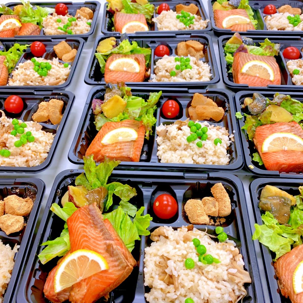 今日は、鮭の照り焼き、さつまいも、茄子、サラダ、わらび餅、キノコご飯です。