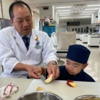 5月13日火曜日、神戸市中央卸売市場の料理教室にて、5月の兵庫五国のうまいもんこども食堂が開催されました、担当は渡辺理事、柏木専務理事、そして今回から甲南女子大学の学生さんが2名の参戦です。